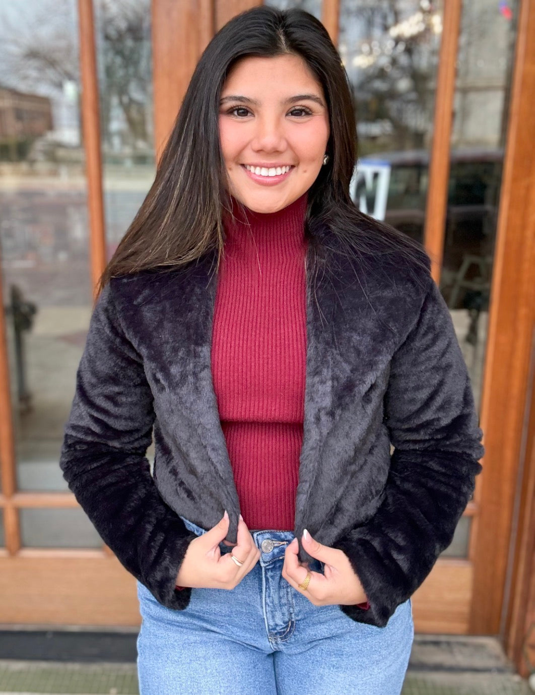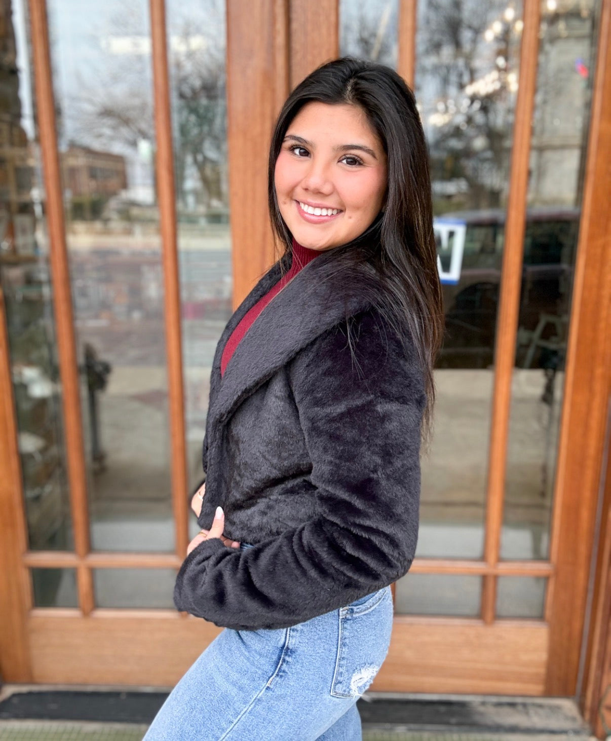 A chic black open-front cropped faux fur coat designed to add instant sophistication to any outfit. Featuring a soft, plush texture and a flattering cropped length, this statement piece layers effortlessly over dresses or casual looks for a polished finish. Perfect for cooler days and nights when you want warmth with standout style.