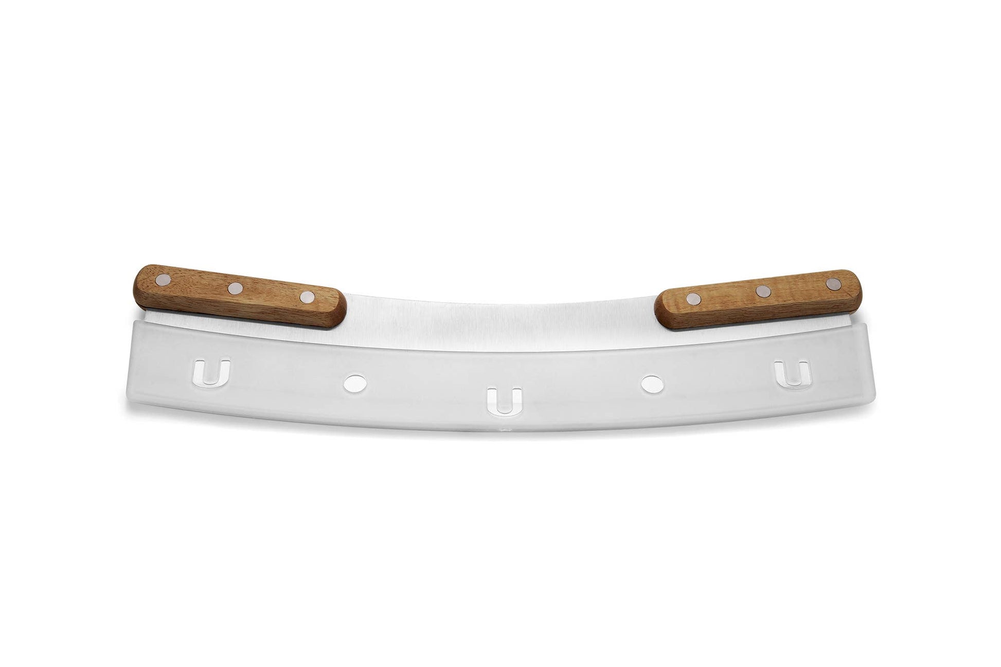 • DURABLE DESIGN: This pizza rocker comes with a beautiful acacia wood handle with a blade made in the artisan craftsmen style of knife makers of years ago. Plus, it comes with a bonus clear polycarbonate edge protector as well.