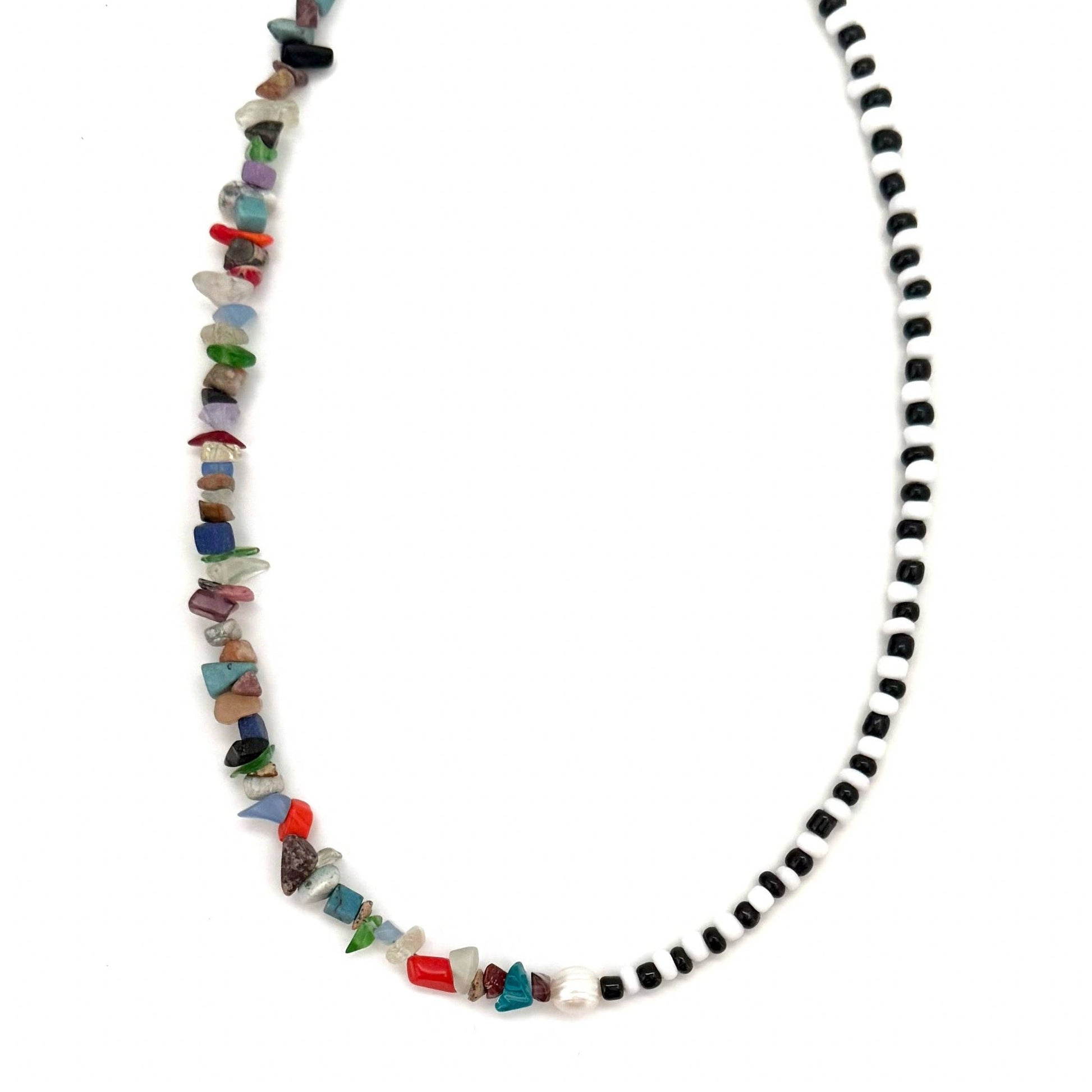 Add a pop of color and texture to your outfit with our Paisley Colorful Stone Pearl Necklace. The multi color gemstone chip beads, accented with black and white glass seed beads, create a fun and funky statement piece. Plus, the center pearl adds an extra touch of elegance. Stand out from the crowd with this must-have accessory!