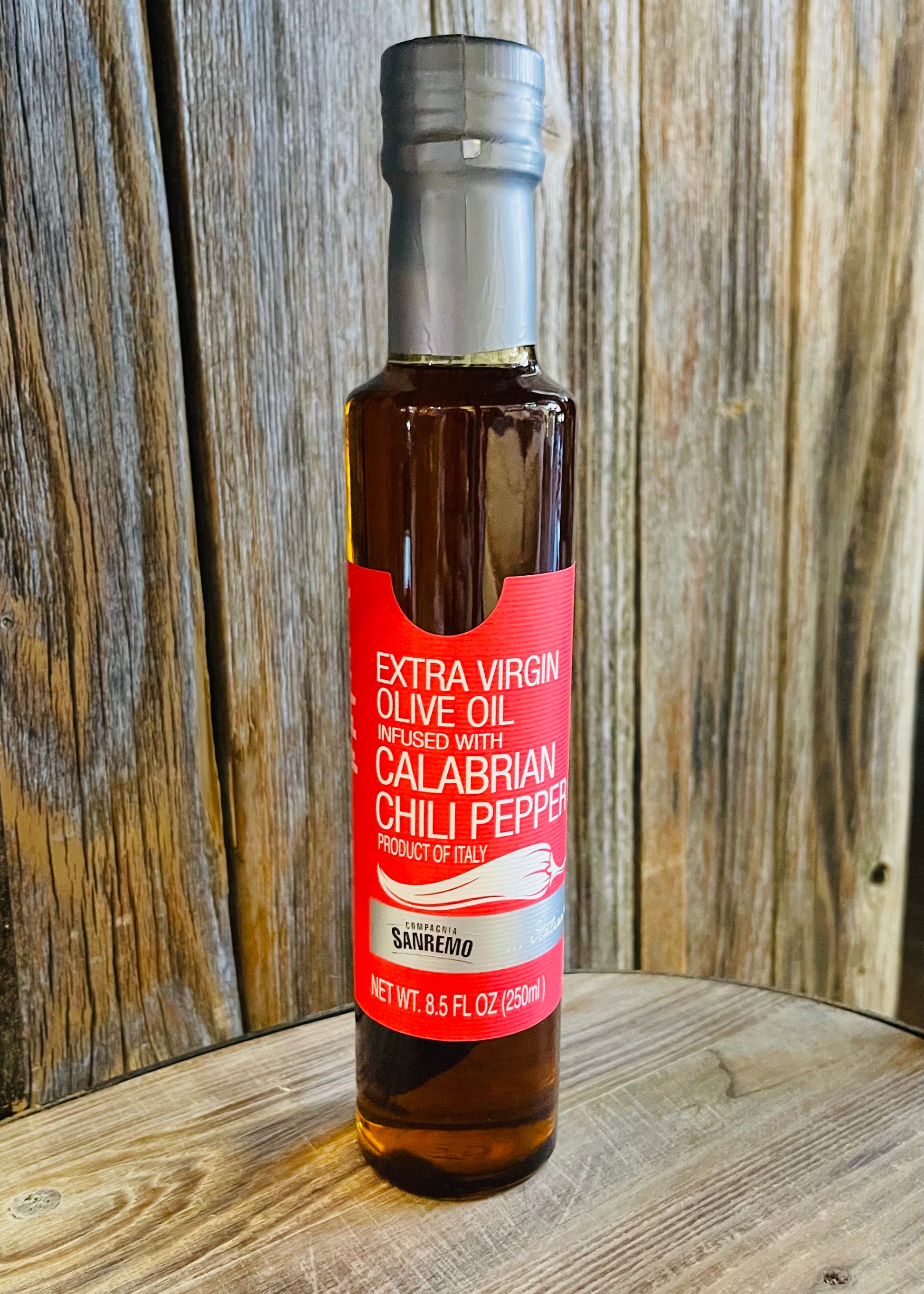 Experience the fiery kick of Co. Sanremo Calabrian Chili Extra Virgin Olive Oil. This 8.5 oz. bottle is a fusion of flavors that are non-GMO. It's shelf-stable with a generous life span of 12-24 months. Our olive oil is sourced from the finest Italian farms, capturing the traditional methods and fresh ingredients that our brand is proud of. Perfect for adding a bit of heat to your dishes, this oil showcases the passion of Italian cooking and rich flavors.