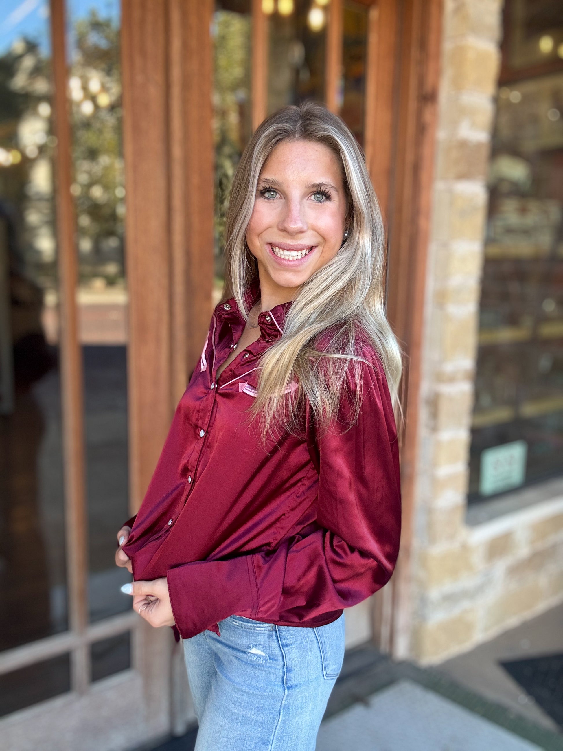 Tops | Blouse Pearl Snap Western Wine/Pink Satin