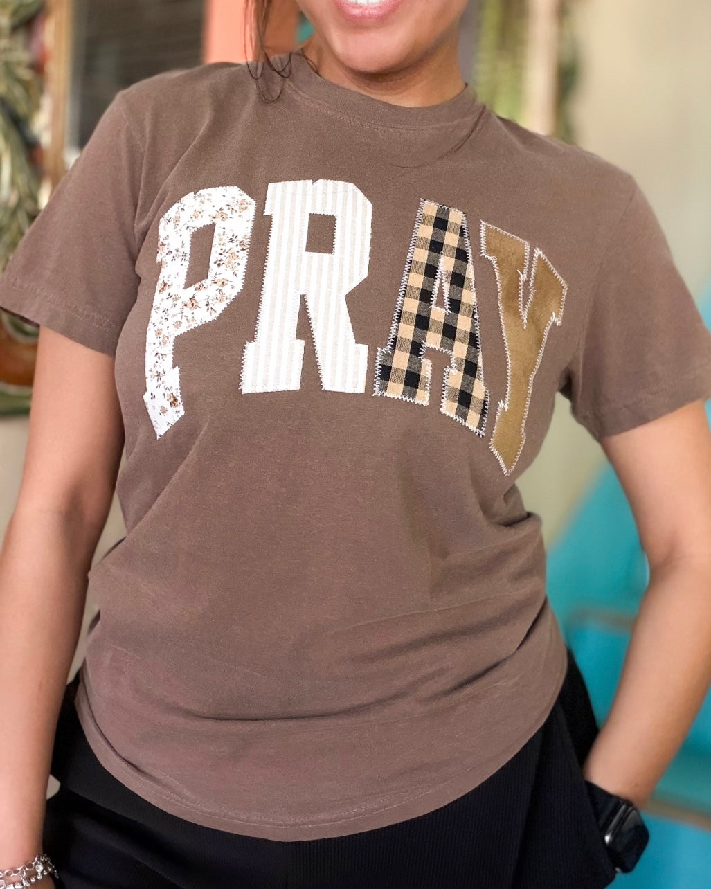 This chocolate brown graphic tee features a bold “PRAY” design in a mix of floral, stripe, and plaid patchwork for a cozy, vintage-inspired look. Made with a soft, breathable fabric and a relaxed unisex fit, it’s perfect for everyday wear. Pair it with denim, joggers, or layered under a jacket for an effortless outfit with a meaningful message.