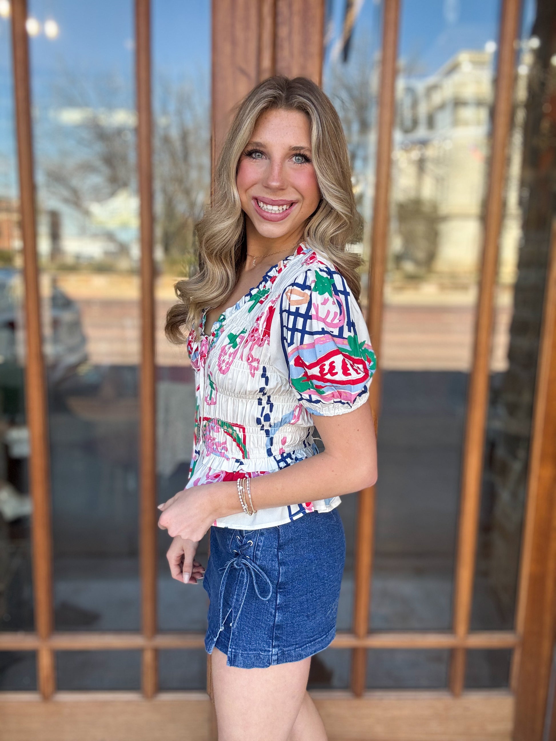 Brighten your everyday style with this playful and feminine top featuring a vibrant, eye-catching print. Designed with soft smocking for a flattering fit, a charming tie-front neckline, and lightweight breathable fabric, this blouse offers all-day comfort with effortless style. Perfect for pairing with denim shorts, skirts, or your favorite jeans for a fun and polished look.