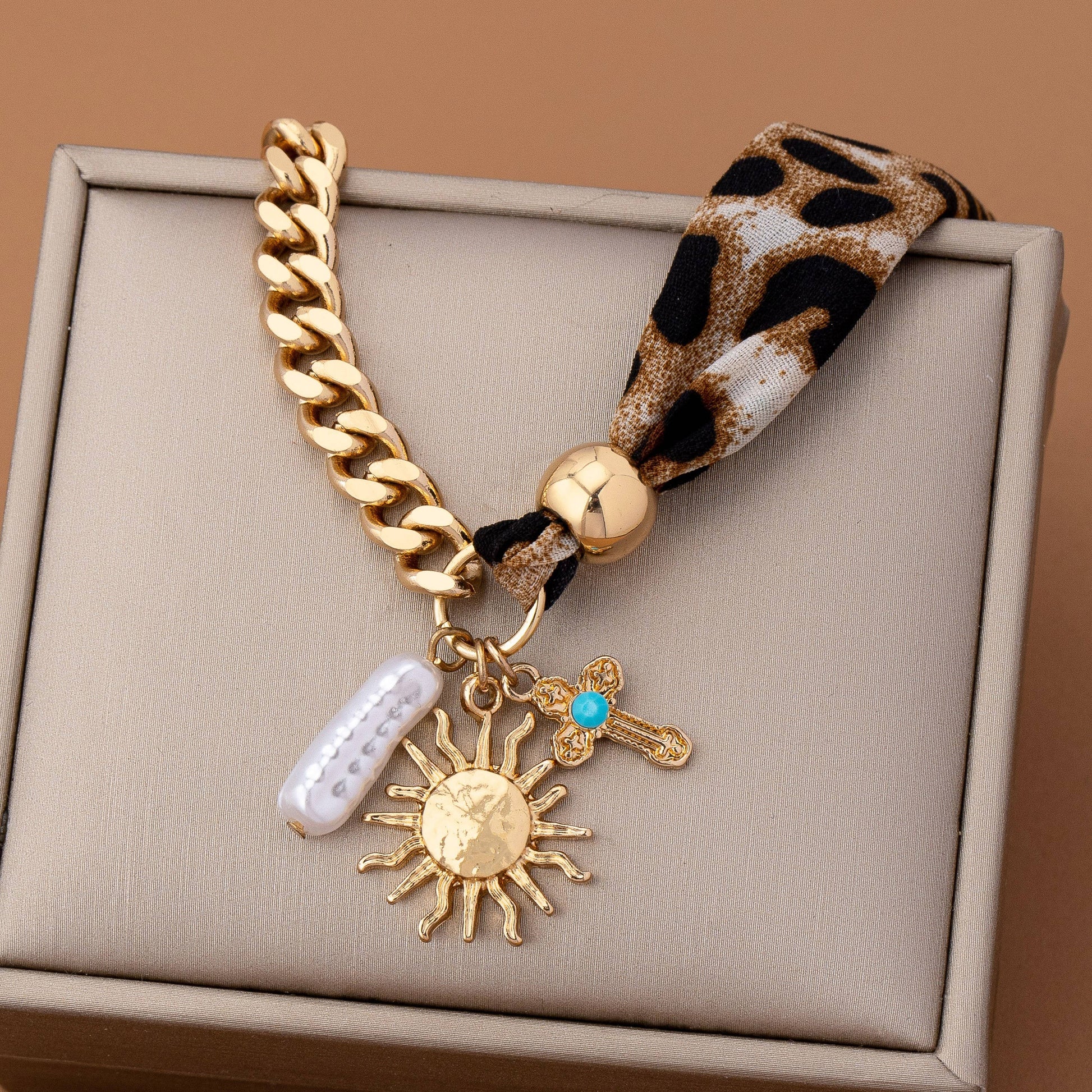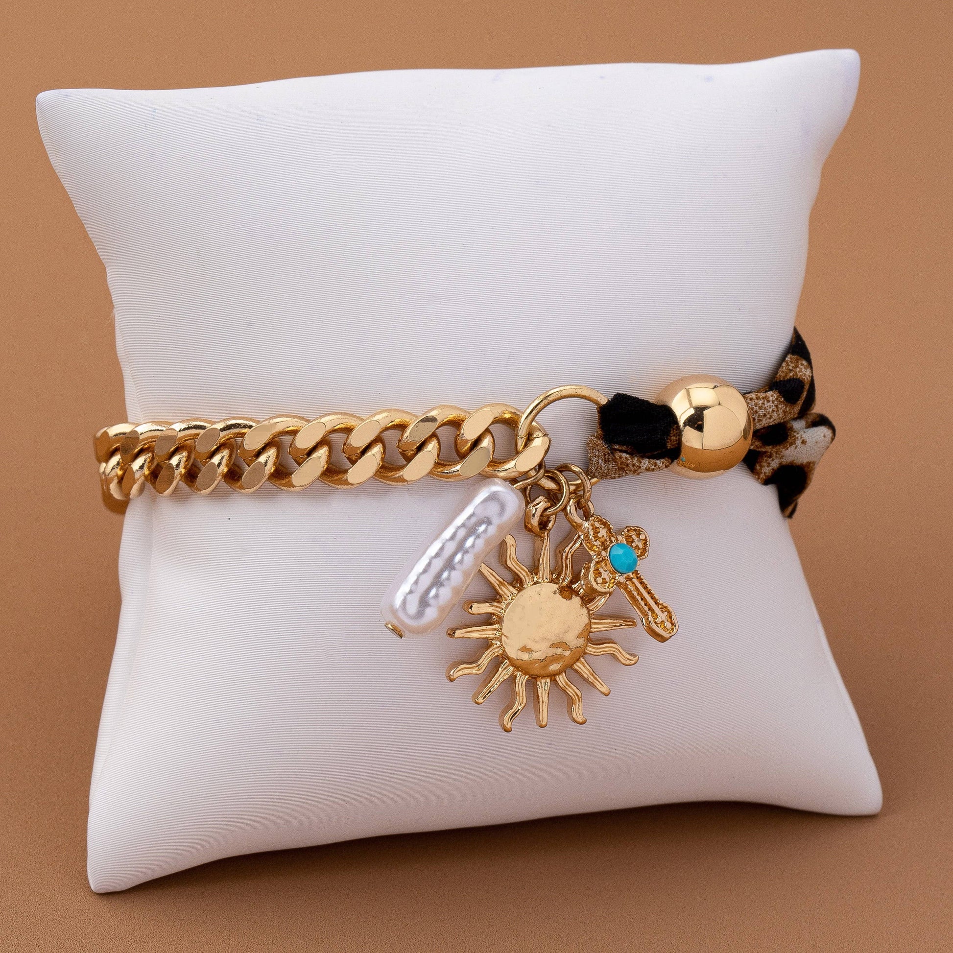 Featuring leopard printed scarf band attached with radiant sunburst, cross and luminous pearl charm. This charm bracelet adds instant style to any outfit. Perfect gift for the holidays, including Christmas, Mother's Day, Valentine's Day.