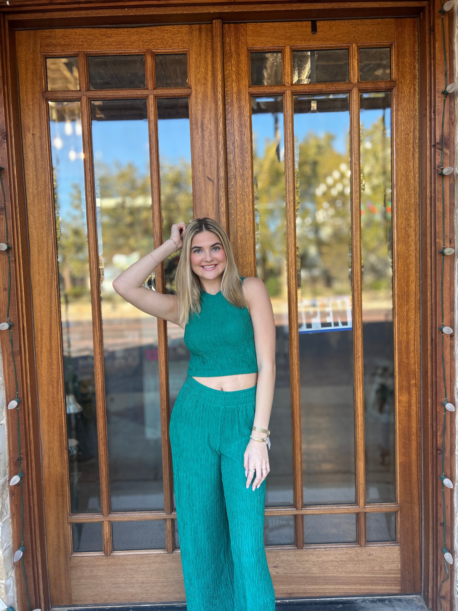 This crinkled textured sleeveless cropped top loungewear set in emerald city. The unique crinkled texture adds a stylish dimension to the set, while the sleeveless cropped top offers a relaxed yet flattering fit. Perfect for lounging, this set can easily be dressed up with accessories and heels for a night out or dressed down with sneakers for a laid-back look.