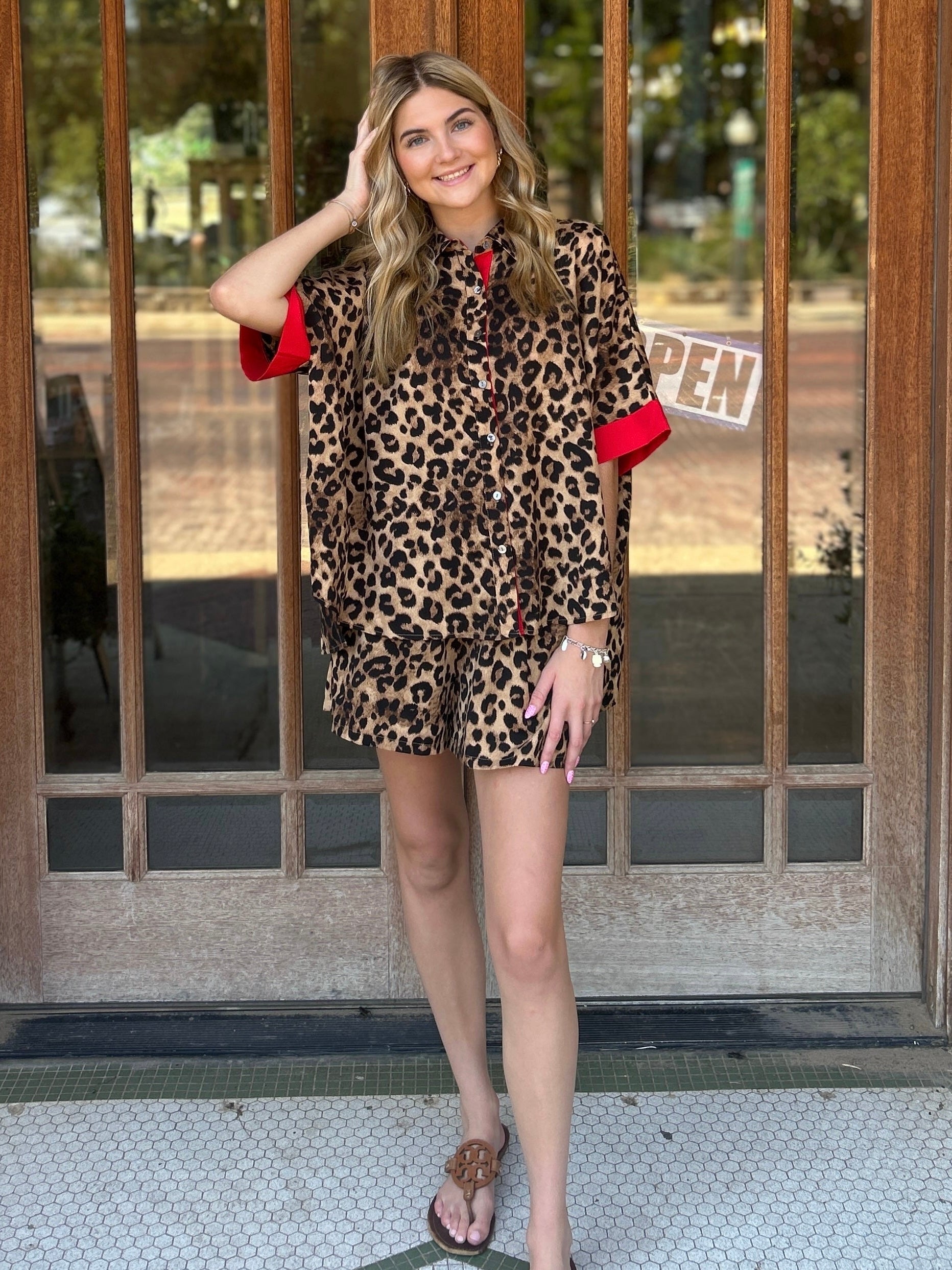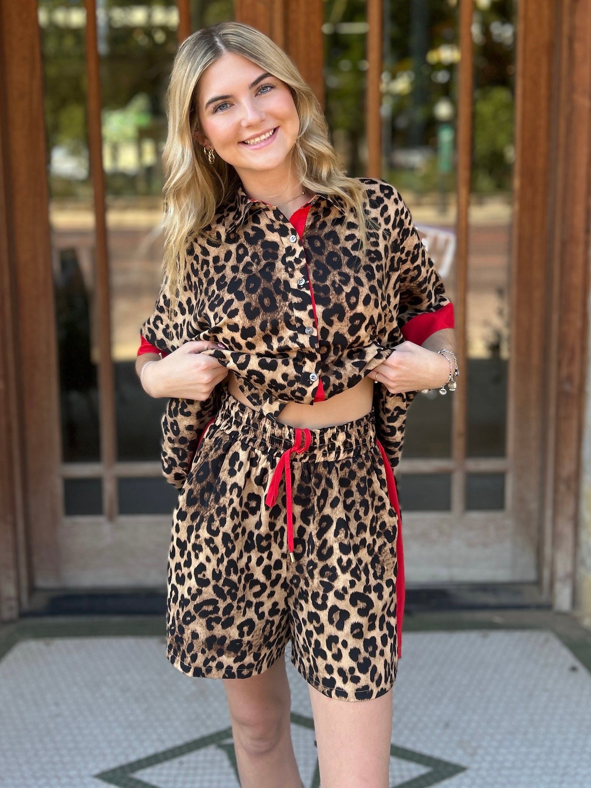 Leopard print two-piece set featuring a button-up short sleeve top with red trim details and matching high-waisted shorts with an elastic waistband and red drawstring tie.