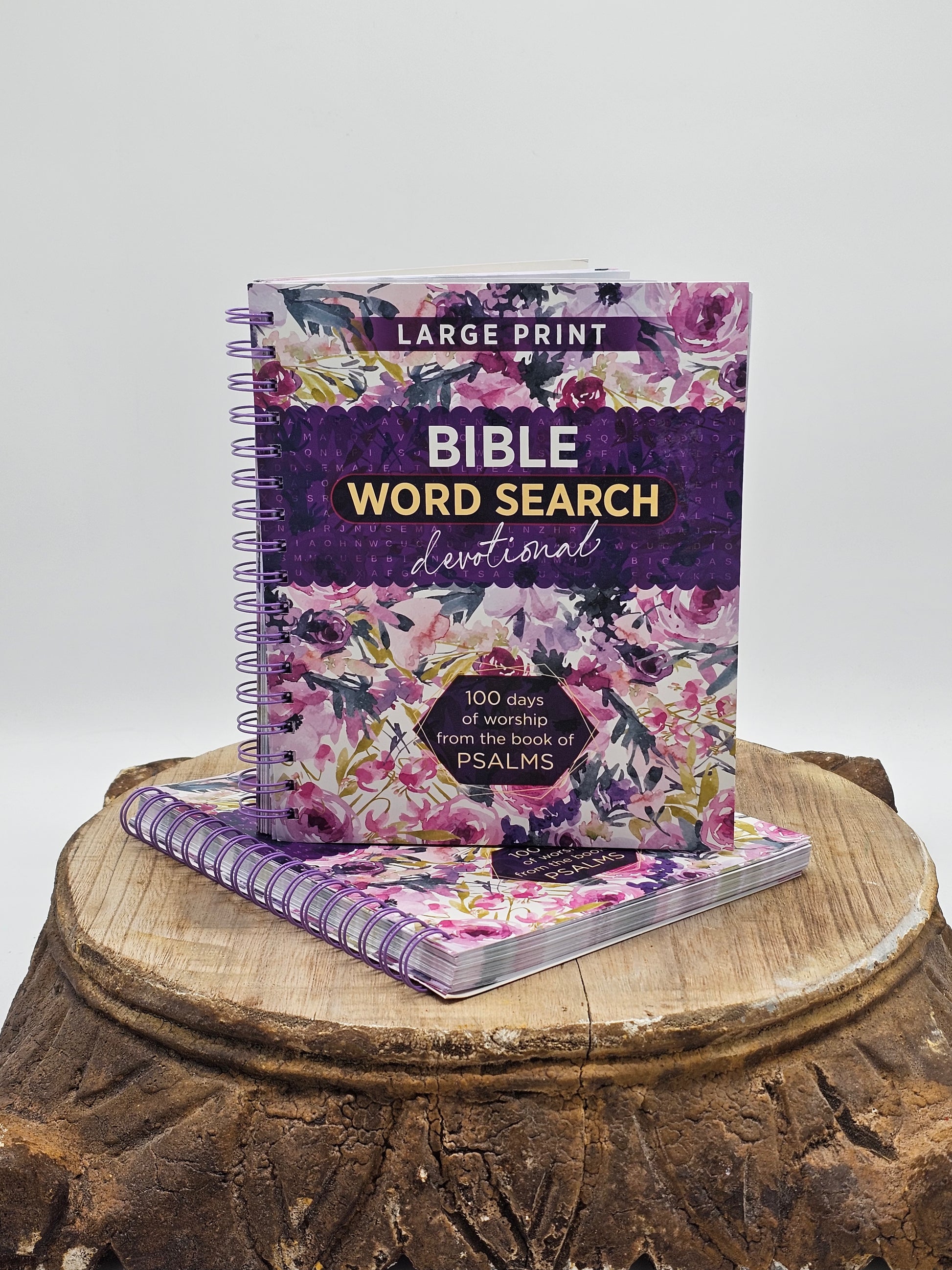 Large Print Bible Word Search Devotional offers 100 days of uplifting worship from the book of Psalms. This beautifully designed spiral-bound book features floral artwork and easy-to-read large print, making it perfect for all ages. Each word search puzzle is paired with inspiring scripture, helping you reflect and grow spiritually while enjoying a relaxing activity. A wonderful way to combine faith, fun, and devotion—ideal for personal study, gifts, or quiet moments of reflection.