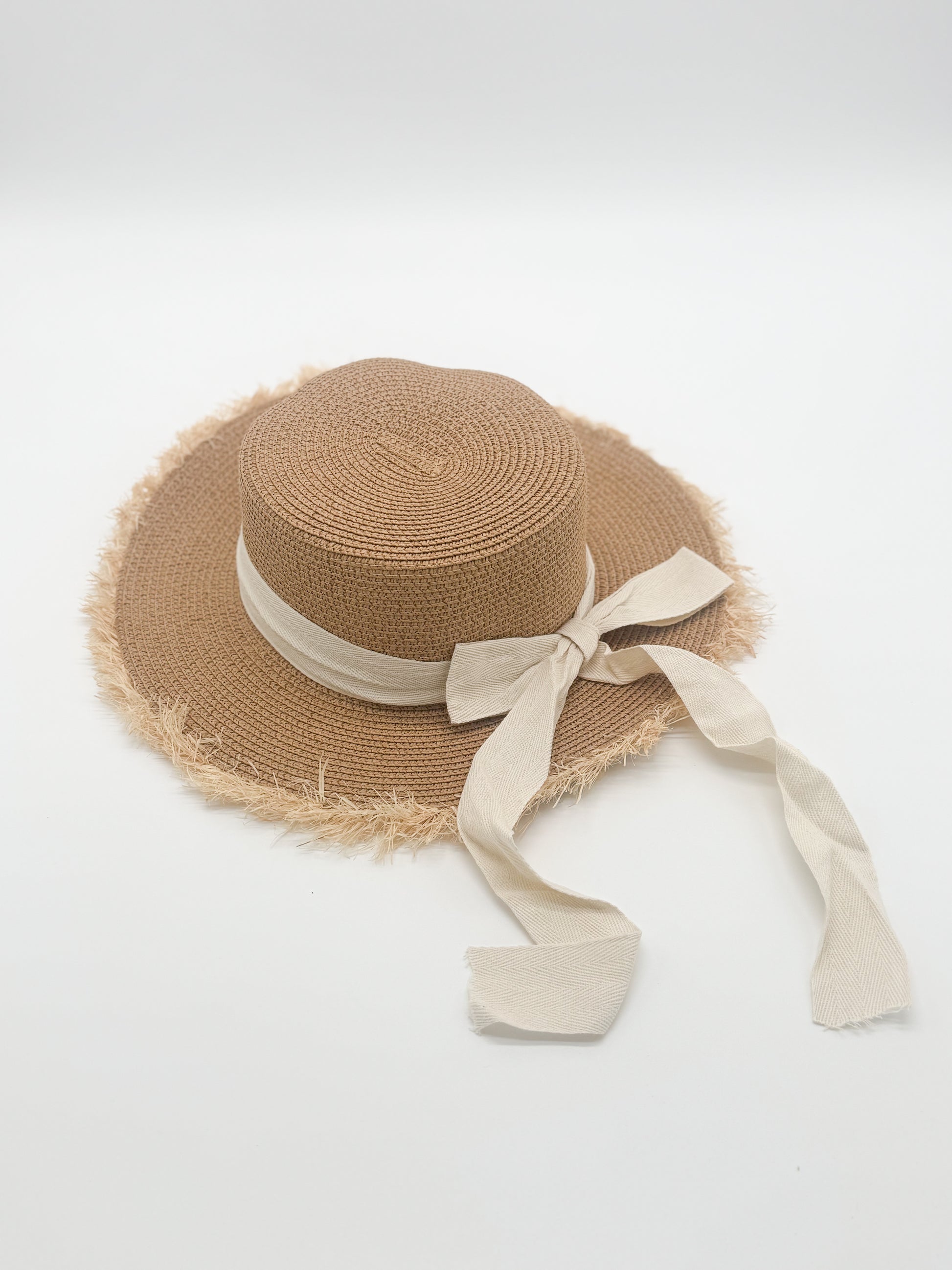 Straw Color With Cream Band and Bow Fringe Edge Hat