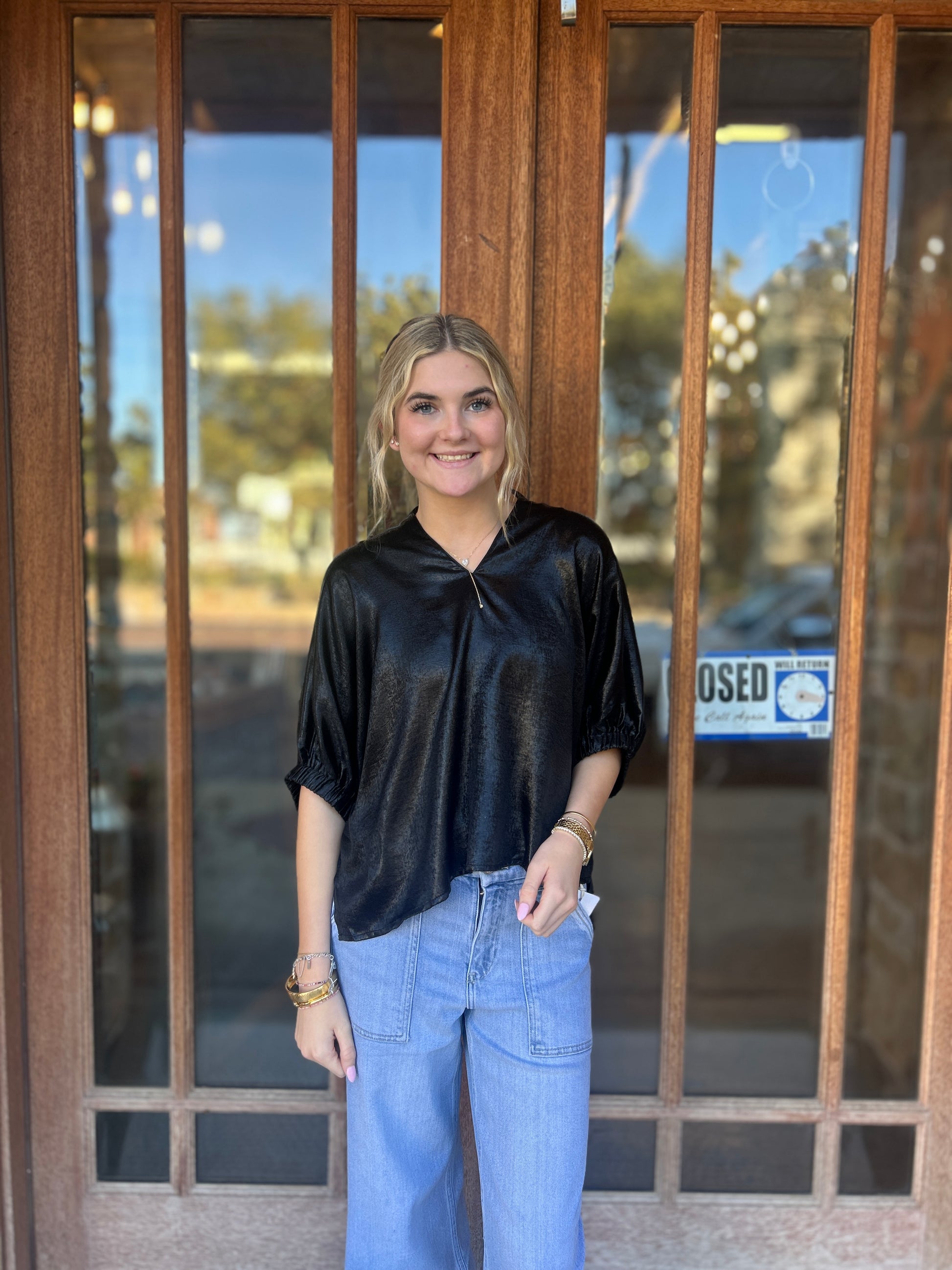 Shine in effortless elegance with this sleek black satin top. Featuring a subtle sheen and relaxed fit, it’s the perfect blend of comfort and sophistication. The soft V-neckline and gathered short sleeves add just the right amount of detail, making it easy to dress up or down. Pair it with your favorite denim for a chic casual look or with trousers for a polished evening style.