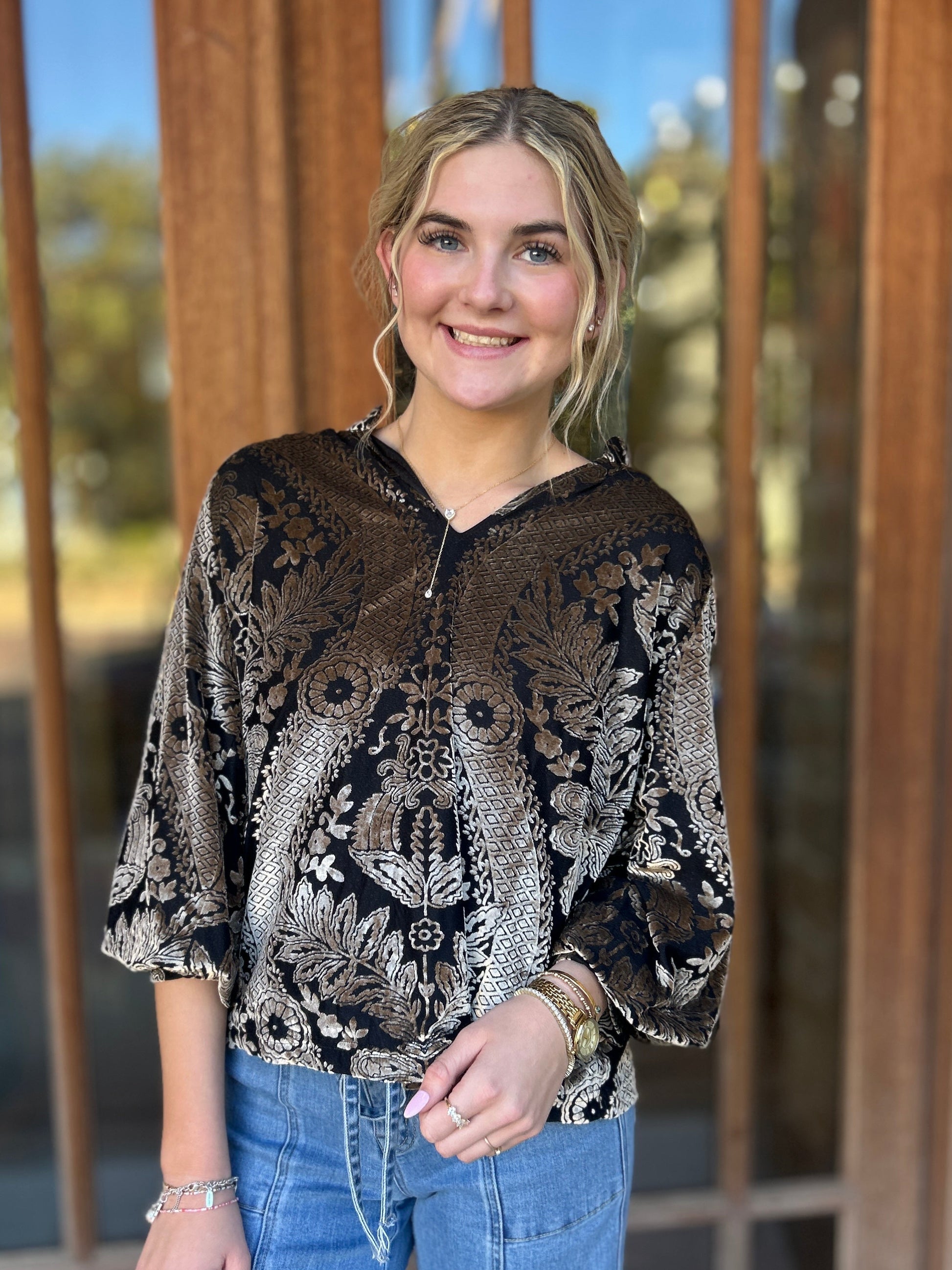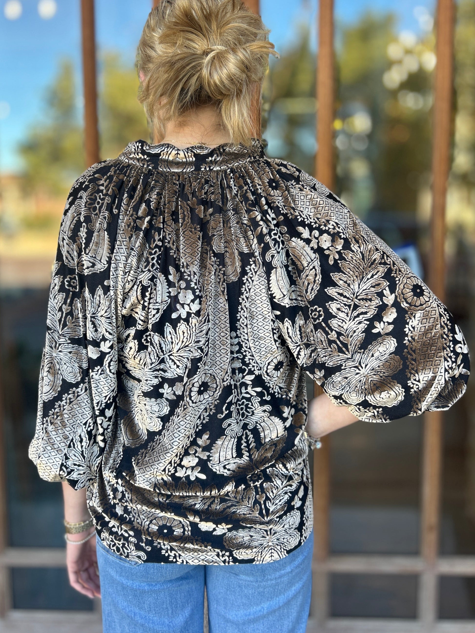 Elevate your wardrobe with this stunning black velvet blouse adorned in a rich gold baroque-inspired print. Designed with a relaxed silhouette and gathered neckline, this top offers a luxurious feel and effortless drape. The billowy ¾ sleeves add a touch of elegance, making it perfect for both casual outings and dressier occasions.