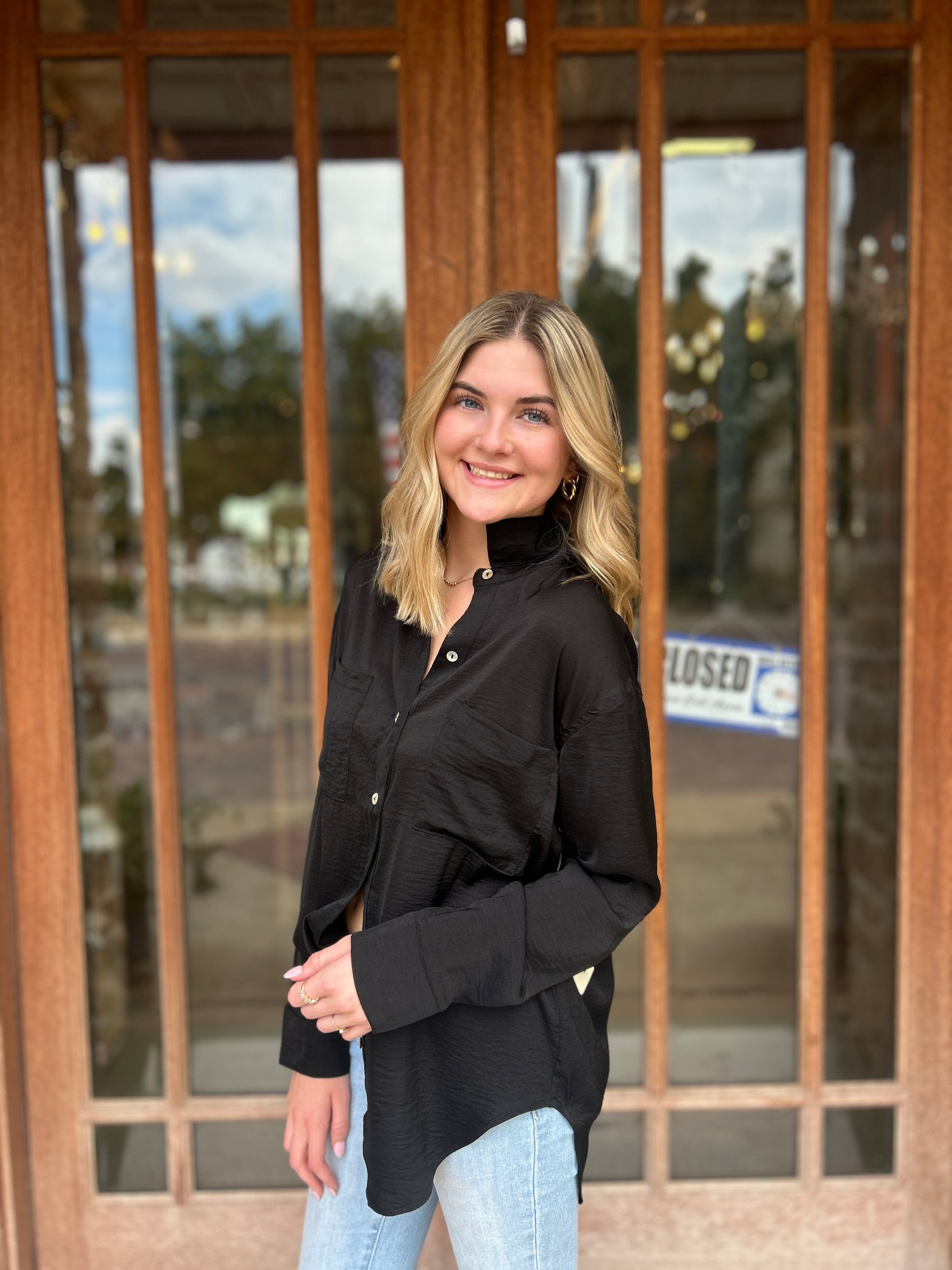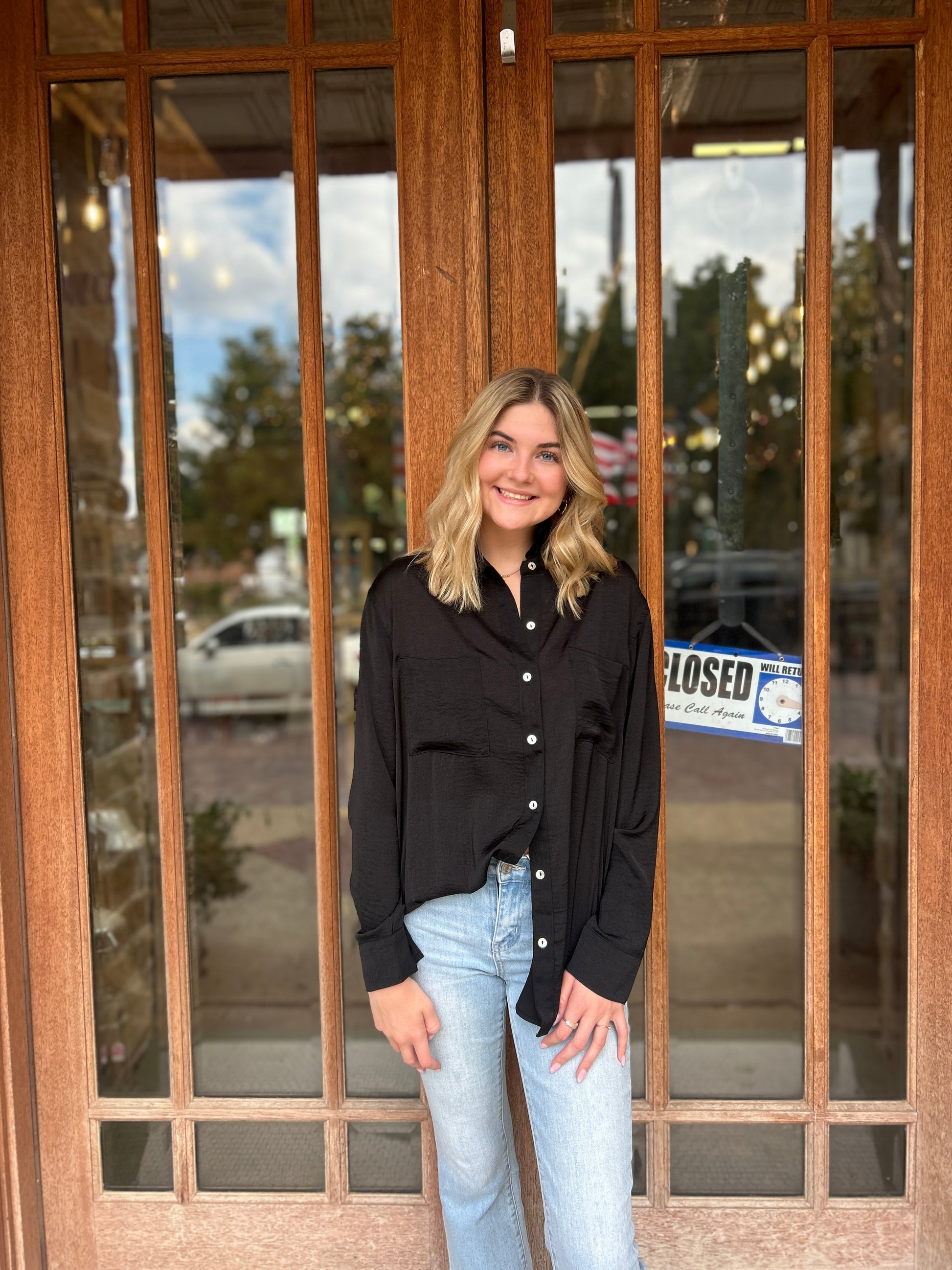 A sleek and timeless blouse featuring a silky black fabric, classic button-down front, and long sleeves. Perfect for dressing up for work or pairing with jeans for an elevated casual look.