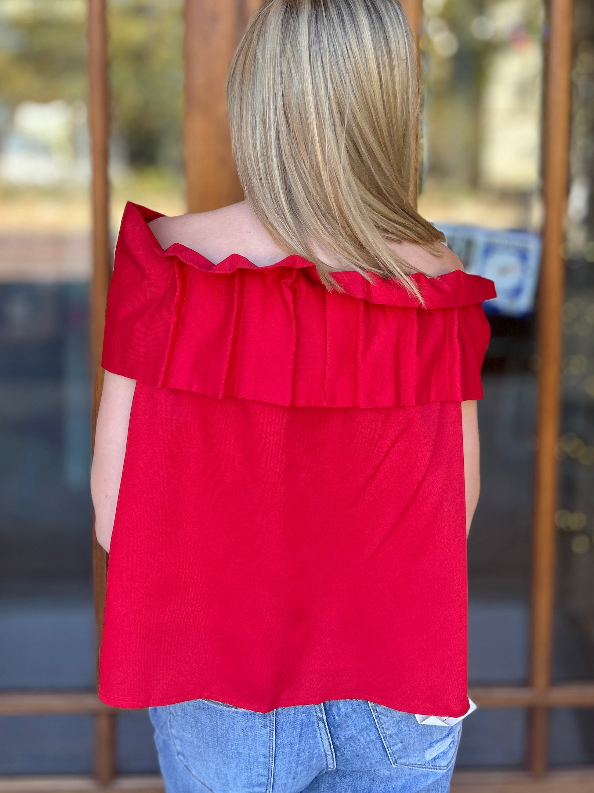 Designed with a flirty off-the-shoulder neckline and a bold statement bow, this top brings the perfect mix of feminine charm and effortless elegance. The vibrant red hue adds a touch of confidence while the flattering fit highlights your silhouette. Dress it up with trousers or pair it with jeans for a cute, elevated everyday look. A must-have piece for holiday parties, date nights, and any moment you want to make unforgettable.