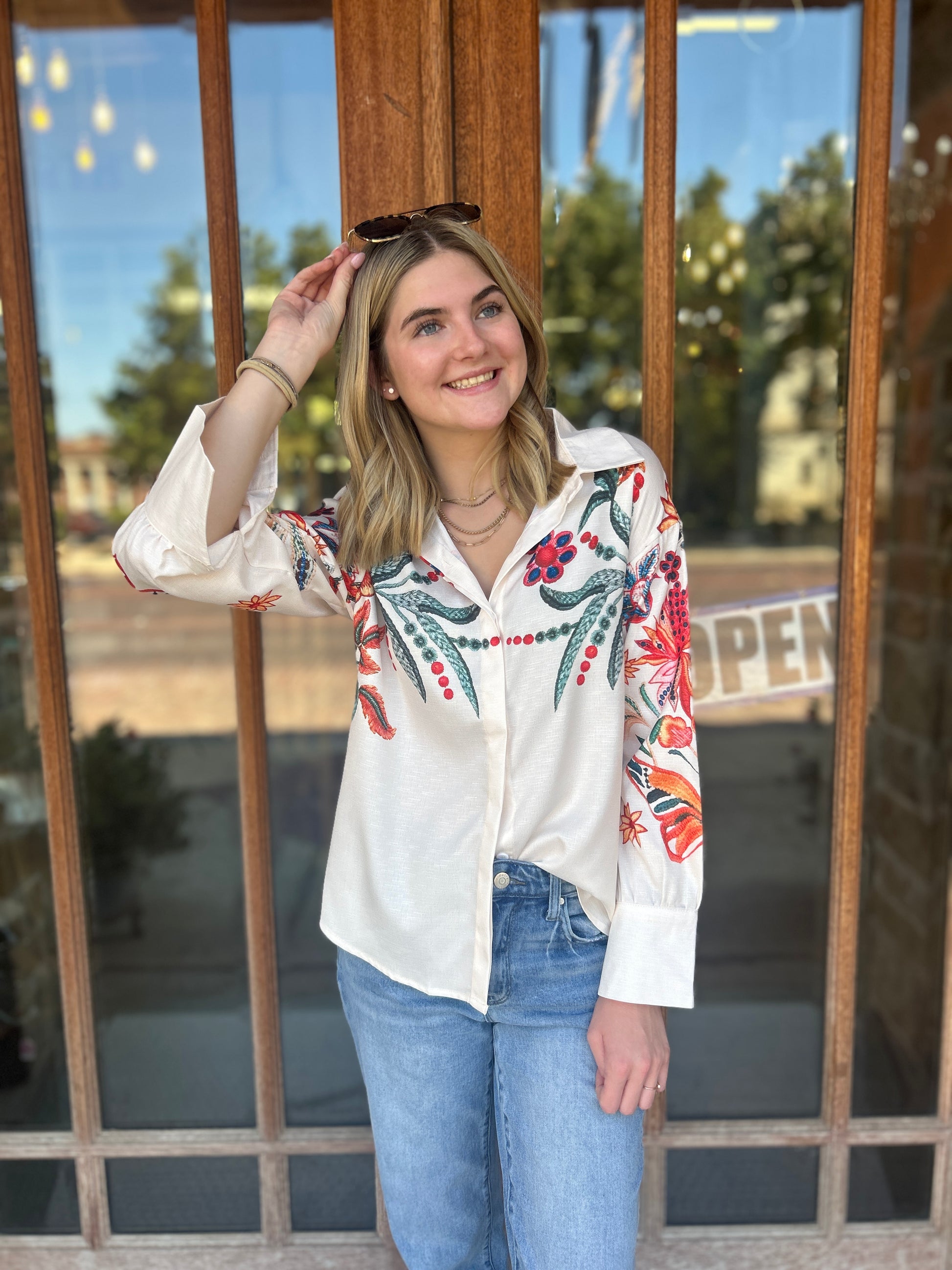A flowy floral blouse with a relaxed fit and long sleeves, perfect for effortless style and all-day comfort. Dress it up with trousers or keep it casual with your favorite jeans.