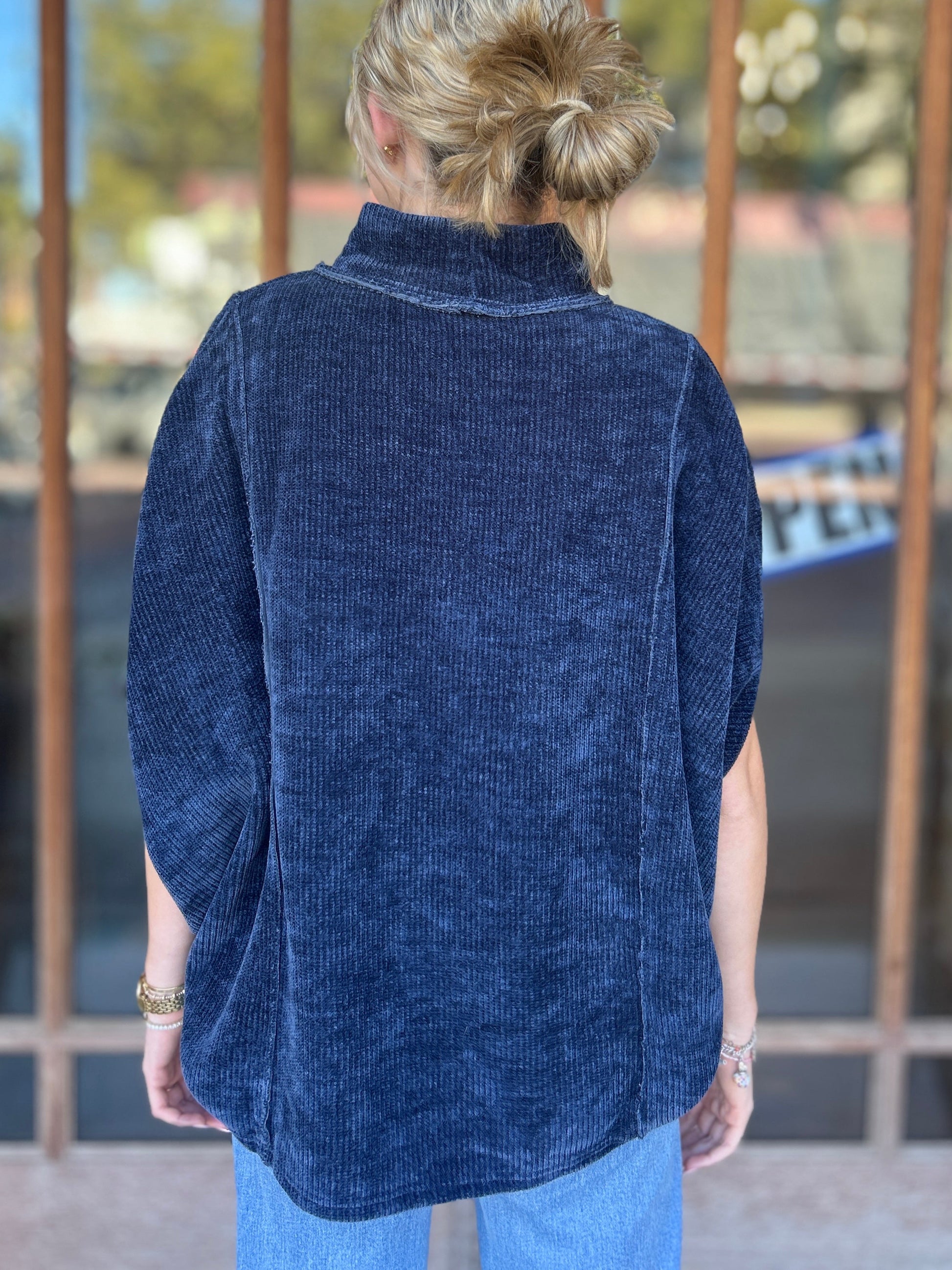 Stay effortlessly cozy in this chic navy poncho-style top. Made from ultra-soft corded fabric, it drapes beautifully with a relaxed, oversized silhouette that flatters every shape. The high mock neck and side-slit sleeves add a modern touch, making it perfect for layering through the cooler seasons.