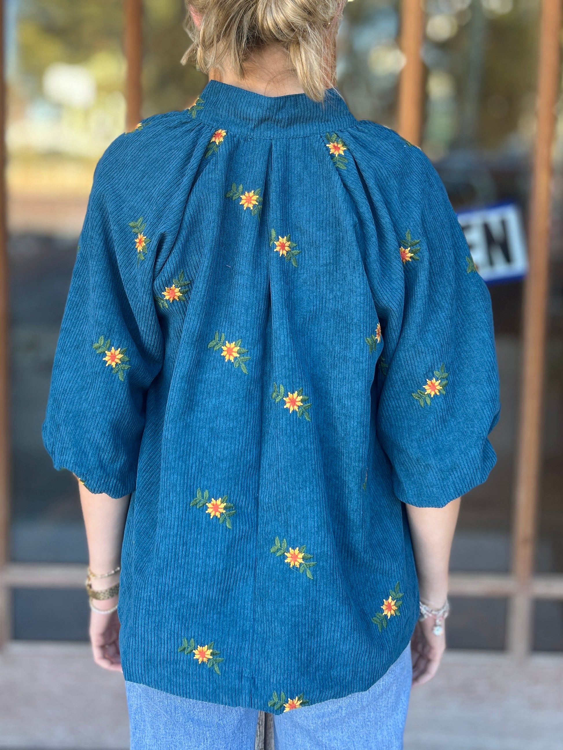 This charming teal blue blouse brings cozy texture and feminine flair together perfectly. Crafted from soft corduroy, it features delicate embroidered yellow floral accents scattered throughout. The relaxed fit and gathered neckline create a flattering, easygoing silhouette, while the ¾ length sleeves add a touch of casual elegance.