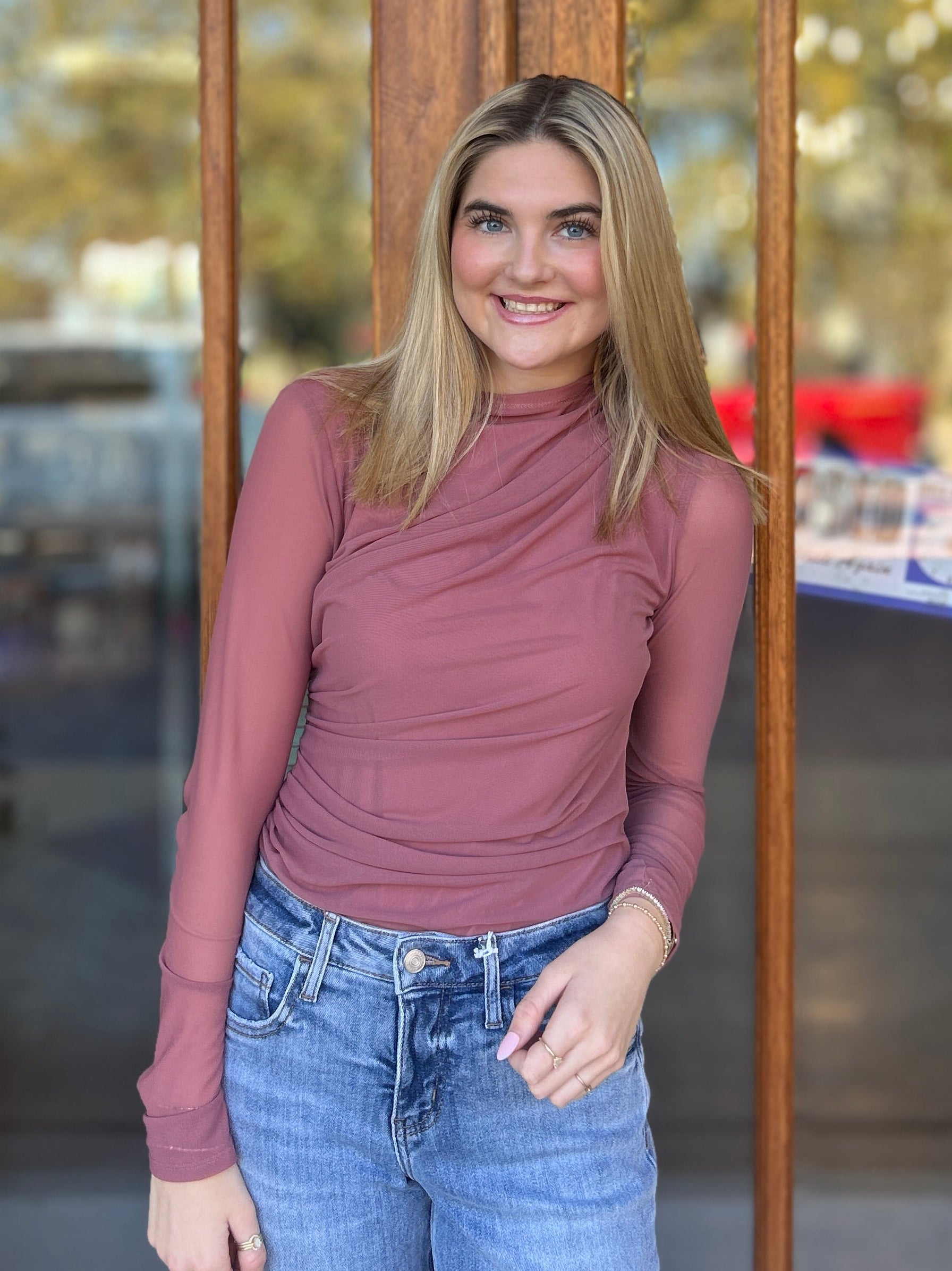 Featuring a rich red-bean hue and flattering all-over ruching, this piece is designed to hug your curves in all the right places. The sheer mesh overlay adds a touch of sultry elegance, while the smooth, fitted bodysuit base keeps everything seamless and secure. Perfect for nights out, holiday events, or any moment you want a bold, confident look.