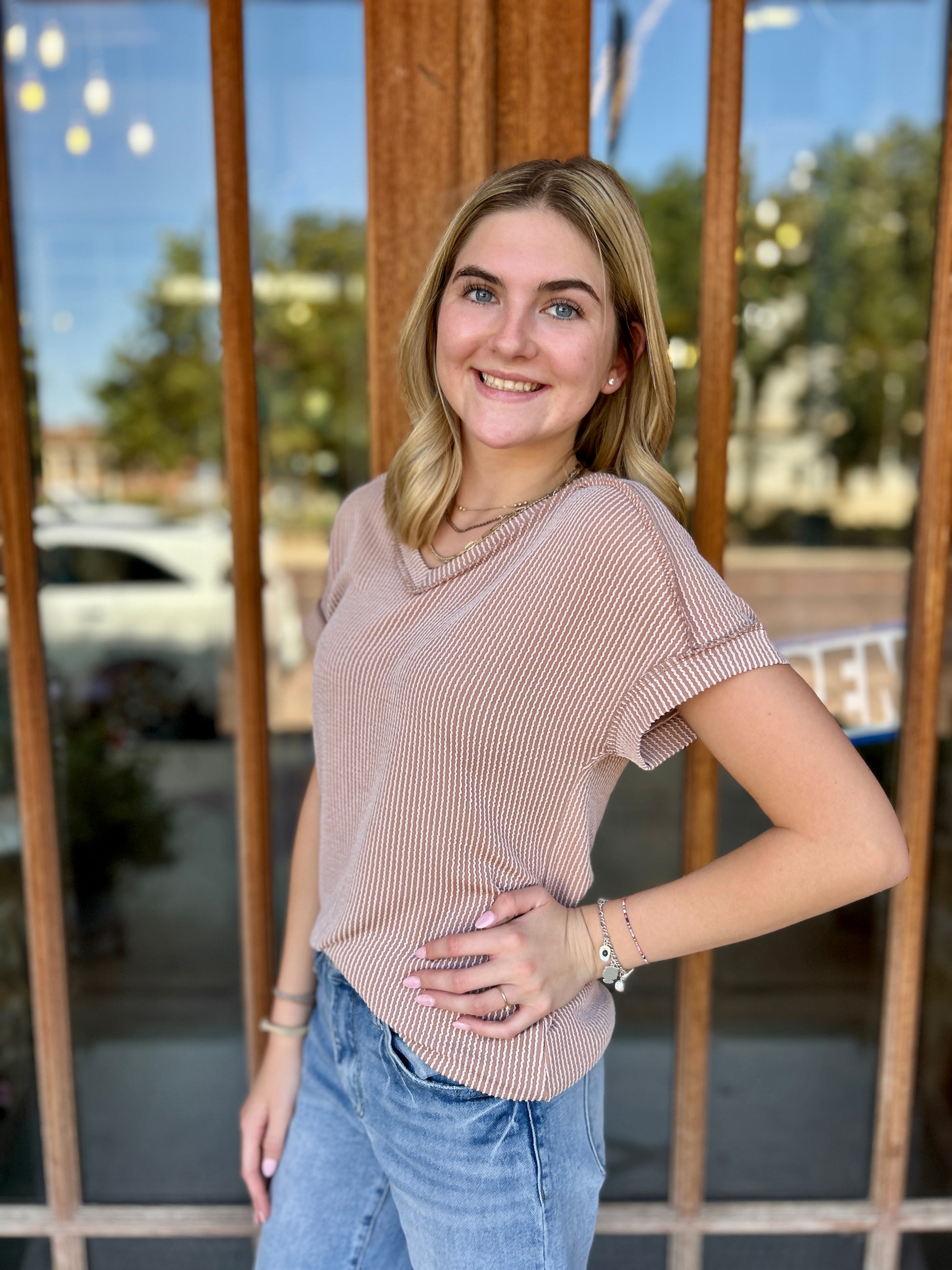 A soft ribbed knit top in a warm brown shade, featuring a flattering V-neckline and short sleeves. Simple, versatile, and easy to style for both casual and layered looks.