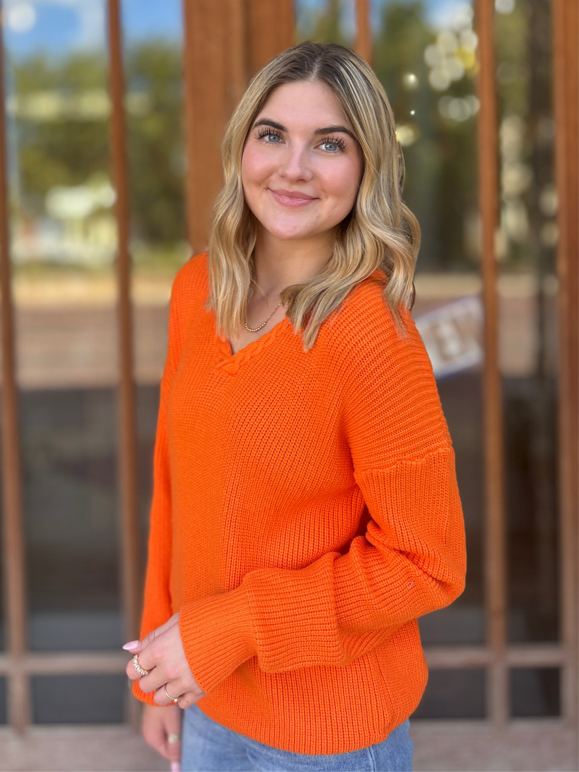 Brighten up your wardrobe with this bold orange knit sweater. Featuring a classic V-neckline, long sleeves, and a relaxed fit, this cozy piece combines comfort with a pop of color. Perfect for pairing with denim or layering over your favorite basics for an effortlessly stylish look.