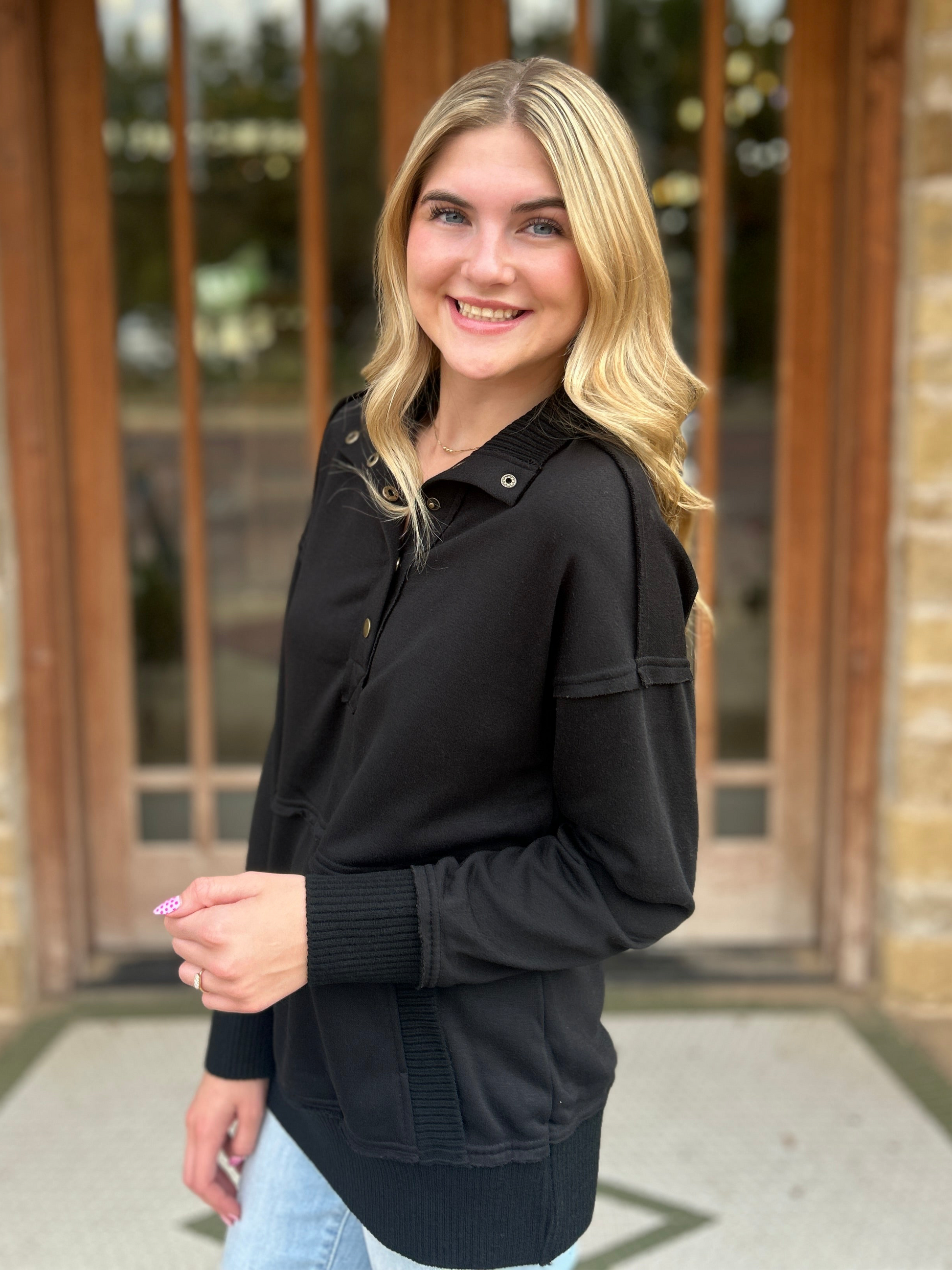 Tops | Sweatshirt Black Exposed Seam Henley Snap